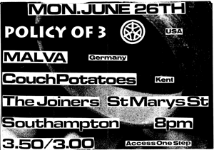 with: CHAOS UK, OI POLLOI, VOORHEES, EX-CATHEDRA, POLICY OF 3, XXX, MALVA, KITO, STALINGRAD, A, MANRAE, BOB TILTON, BABYHARPSEAL, ABOVE ALL, TRIBUTE, BABY SILVER SKIN, STAMPING GROUND, WITHDRAWN, SCHEMA, UNDERCLASS