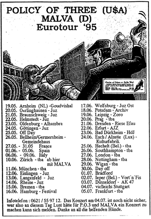 1992 gründeten die drei Freunde Bi Digi (Schlagzeug), Jacques Wolgast (Bass) und Schnitzel Schneider (Gitarre, heute auch Gesang) aus Leverkusen-Schlebusch Malva, und gehören mit zu den Wegbereitern der deutschen “Emocore“-Szene. Nach unzähligem Sänger- und Gitarristen-Verschleiß, spielten Malva in einer festen Fünfer-Konstellation mit italienisch-englischem Gesang über 100 Konzerte. 1995 gingen sie auf Europatour als Support der amerikanischen “Emo“-Legende Policy Of 3. Zu diesem Anlaß erschien ihre erste 7’’ »Das Leben ist kein Picknick« auf Equality Records. Heute besinnen sich Malva wieder auf die Urbesetzung. Ihr Anliegen ist es nicht, sich und ihre Musik neu zu erfinden, sondern weiter energetische Gitarrenmusik zu machen jetzt mit deutschen Texten die ohne Schnörkel und Effekte auskommt. Dabei treffen filigrane Walzerklänge und poptaugliche Melodien auf düstere Gitarren-Wände und eine gute Portion Feedback. Die Musik kommt aus dem Bauch, und will auf ihre punkige Ungeschliffenheit vor allem eines sein ehrlich. Ende dieses Jahres veröffentlichen Malva eine LP auf ihrem eigenen Label USE (www.useuse.de).